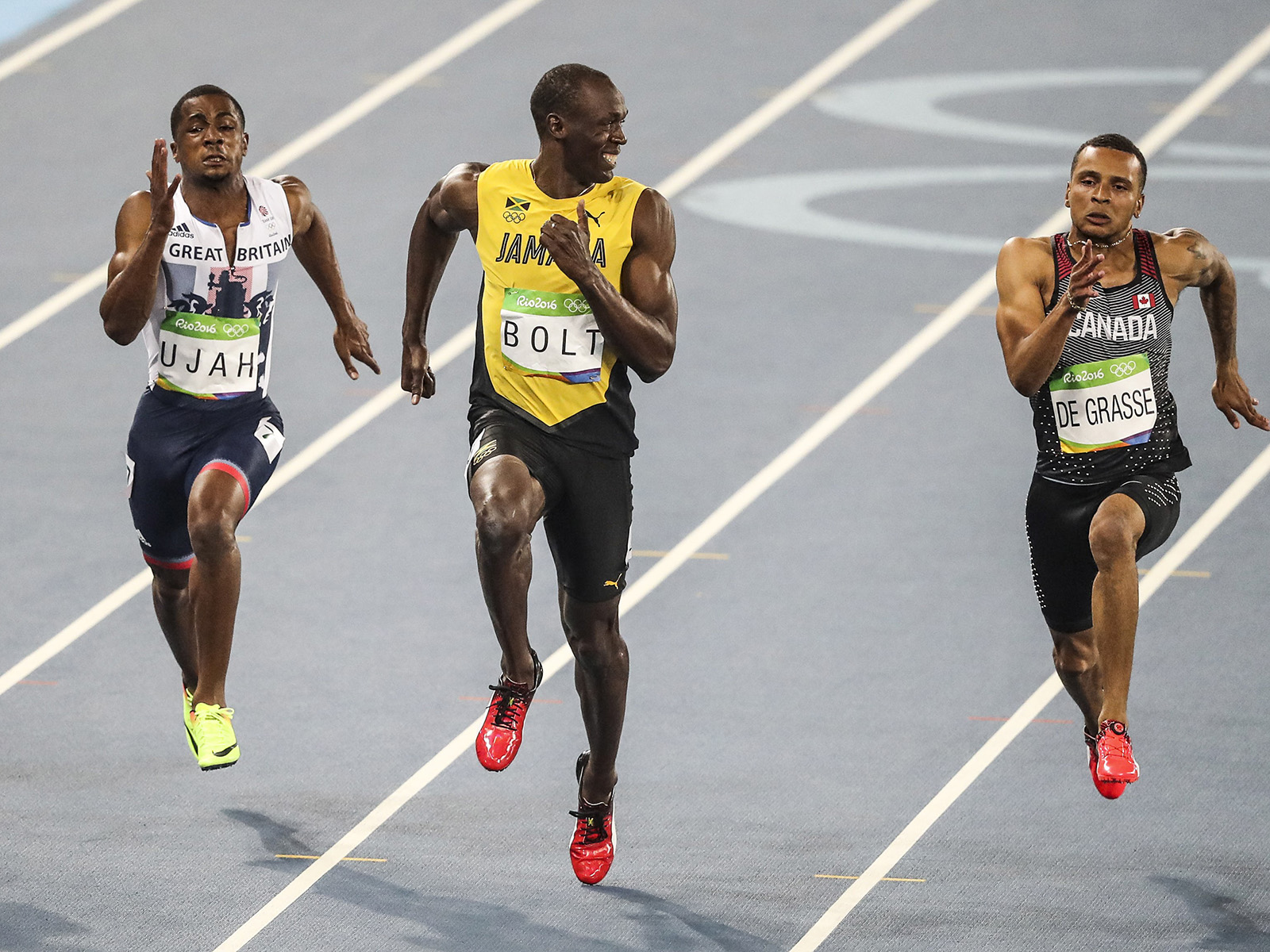 RIO DE JANERIO, BRAZIL – AUGUST 14: Usain Bolt of Jamaica (C) smiles as he looks at Canada’s Andre De Grasse (R) in the Men’s 100 meter semifinal of the Rio 2016 Olympic Games in Rio de Janeiro, Brazil on on August 14, 2016. (Photo by Salih Zeki Fazlolu/Anadolu Agency/Getty Images)
